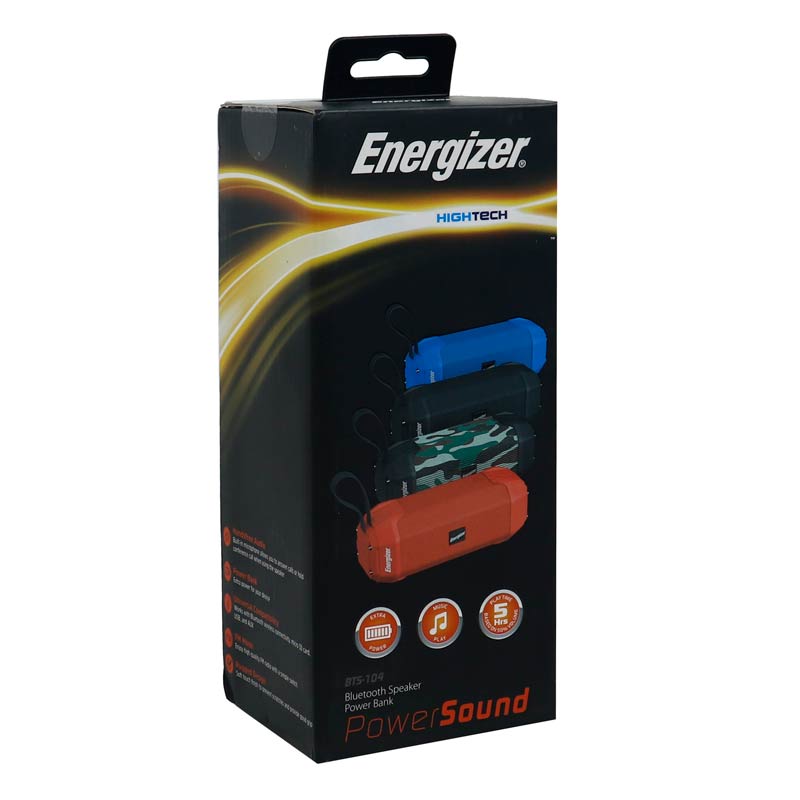اسپیکر بلوتوثی قابل حمل انرجایزر مدل BTS104، در طراحی زیبا با بدنه ای از متریال مرغوب و باکیفیت ساخته شده که از مقاومت بالایی در برابر ضربه، افزایش حرارت و دیگر آسیب ها برخوردار می باشد و در قسمت کناری این بدنه یک بند کوچک جهت آویختن و جابجایی آسان تر دستگاه در نظر گرفته شده است. این محصول به صورت بی سیم و از طریق بلوتوث نسخه ۵٫۰ به گوشی موبایل، تبلت و دیگر دستگاه های هوشمند متصل می شود تا در صورت نبود مانع ارتباطی پایدار و بدون قطعی را با شعاع اتصال ۱۰ متر برای پخش انواع فایل های صوتی فراهم سازد. از طریق اتصال با سیم و به وسیله رابط جک ۳٫۵ میلی متری صدا نیز Energizer BTS-104 قادر به برقراری ارتباط با سایر دستگاه های فاقد بلوتوث خواهد بود. همچنین از طریق پورت خروجی USB و شیار کارت حافظه امکان استفاده از رم میکرو SD و فلش مموری و دسترسی به فایل های صوتی و آهنگ های ذخیره شده کاربر وجود دارد.