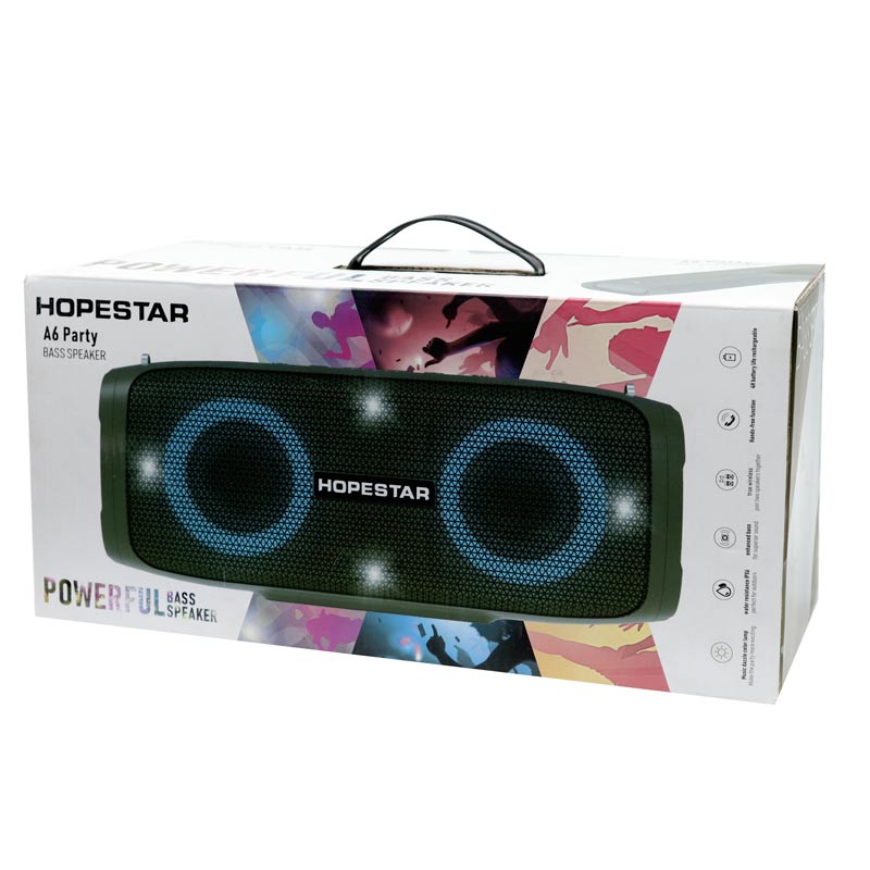 درایورهای دوگانه هوپ استار برای اسپیکر بلوتوثی رم و فلش خور مدل A6 Party قادر اند صدایی شفاف و استریو را پخش نمایند. قدرت صدای خروجی این دستگاه با دو بلندگو قدرتمند استریو و توان کلی ۳۰ وات و محدوده پاسخگویی فرکانسی در داینامیک رنج ۱۰۰ هرتز الی ۱۰ کیلو هرتز، امکان شنیدن طیف وسیعی از صداهای زیر و بم را بسیار واضح، ۳۶۰ درجه، Surround با بیس قدرتمند ارائه می دهد و با این قابلیت ها و کارایی که به همراه دارد در فضای باز و مکان های شلوغ نیز صدای بلند و باکیفیتی را به گوش می رساند.