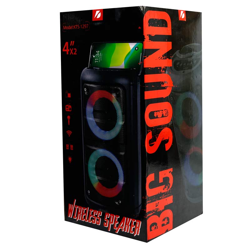 اسپیکر KTS-1297 دارای بدنه ای خوش ساخت همراه با متریال مرغوب و مقاومی می باشد که صدایی رسا و قدرتمند را حتی در محیط های باز و شلوغ به گوش می رساند. در طراحی این اسپیکر، شیاری به عنوان هولدر نگهدارنده گوشی موبایل و …، همچنین محفظه ای به عنوان دسته نیز برای حمل و جابجایی راحت تر این دستگاه درنظر گرفته شده است تا علاوه بر پخش صدای باکیفیت، امکانات دیگر نیز در اختیار کاربر قرار بگیرد. اتصال بی سیم این پخش کننده صوتی از طریق بلوتوث به گوشی موبایل، تبلت، لپ تاپ و دیگر دستگاه ها تا شعاع ۱۰ متری بدون قطعی برقرار می شود. همچنین رابط جک صوتی ۳٫۵ میلی متری (AUX)، شیار کارت حافظه برای قرار دادن رم میکرو SD و پورت USB فلش مموری نیز فراهم شده تا کاربر امکان پخش و دسترسی به آرشیو فایل های صوتی ذخیره شده را نیز داشته باشد. قابلیت نورپردازی LED نیز برای درایورهای این دستگاه پخش کننده وجود دارد که جذابیت و زیبایی این اسپیکر را در هنگام پخش موسیقی دو چندان خواهد کرد. پنل دکمه های فیزیکی بر روی بخش بالایی این اسپیکر تعبیه شده که مدیریت پخش موسیقی، نورپردازی، Mode و … جهت دسترسی آسان تر در اختیار کاربر باشد.
