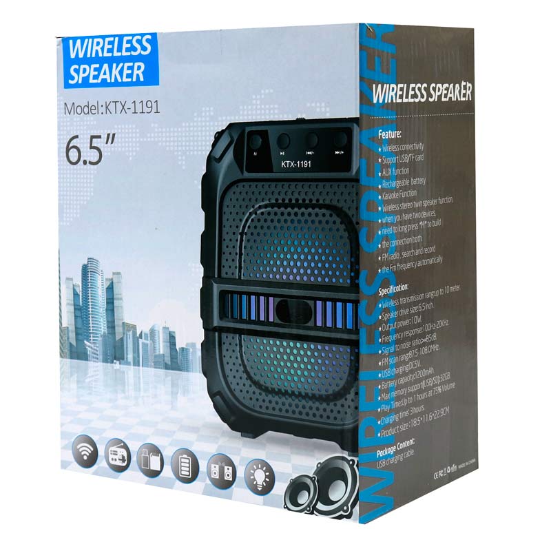 اسپیکر پرتابل KTX-1191 از بدنه ای به جنس پلاستیک مقاوم، با ظاهری مکعبی ساخته شده و دارای نورپردازی دلنشین به کمک LED های داخلی است. این اسپیکر از طریق بلوتوث با برد موثر شعاع ۱۰ متر ارتباطی پایدار را با گوشی موبایل، تبلت، لپ تاپ و و دیگر دستگاه های سازگار برقرار می نماید و همچنین امکان اتصال باسیم آن به گجت های هوشمند و سیستم کامپیوتری از طریق رابط جک ۳٫۵ میلی متری صدا وجود دارد. کاربران می توانند با بهره مندی از شیار کارت حافظه و پورت USB و استفاده از رم میکرو و فلش مموری دسترسی آسانی به انواع فایل های صوتی ذخیره شده شامل پادکست و موزیک داشته باشند. علاوه بر این KTX-1191 از دریافت امواج رادیو FM در بازه فرکانسی ۸۷٫۵ الی ۱۰۸ مگاهرتز، برای پخش و شنیدن برنامه های مورد علاقه کاربران نیز پشتیبانی کرده و مجهز به قابلیت همخوانی با آهنگ و کارائوکه می باشد. KTX-1191 با توان خروجی ۱۰ وات و نسبت سیگنال به نویز ۸۵ دسی بل در کنار برخورداری از درایو به قطر ۶٫۵ اینچ، صدایی استریو و شفاف را به گوش کاربران می رساند. این اسپیکر بلوتوثی دارای باتری داخلی به ظرفیت ۱۲۰۰ میلی آمپر ساعت بوده و می تواند ماندگاری حدود بیش از ۱ ساعت با ولوم ۷۵ درصدی را در هنگام پخش موسیقی ارائه دهد. قابلیت شارژ مجدد این باتری نیز به وسیله ی اتصال کابل میکرو یو اس بی همراه به پورت روی بدنه با گذشت حدود سه ساعت در نظر گرفته شده است. این اسپیکر از فناوری TWS جهت اتصال همزمان دو اسپیکر مشابه به یک منبع بلوتوث و تقویت قدرت صدای در حال پخش پشتیبانی نموده و دارای استانداردهای CE ،FCC و RoHS مربوط به سلامت و ایمنی محصول است.