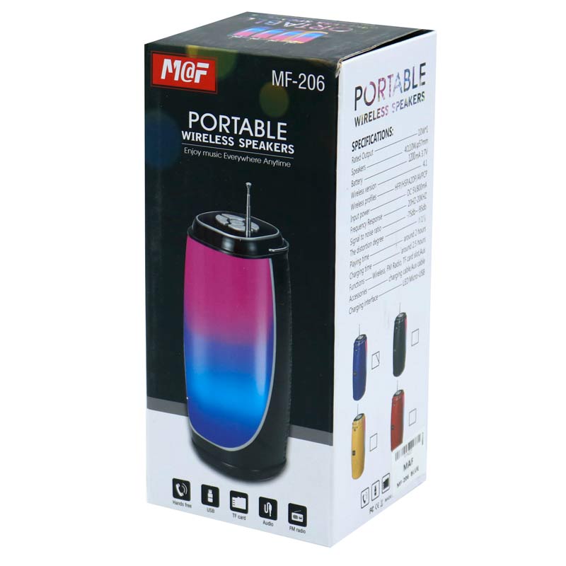 اسپیکر مدل MF-206 از بدنه ای به جنس پلاستیک و فلز ساخته شده است و از مقاومت نسبتا مناسبی در برابر ضربه و دیگر آسیب های احتمالی برخوردار می باشد. یک دسته نیز بر روی این دستگاه پخش کننده صوتی تعبیه شده که حمل و جابجایی آن را در محیط های مختلف برای کاربر راحت تر می کند. درایور این اسپیکر قادر است با توان خروجی ۱۰ وات در محدوده فرکانسی ۶۰ هرتز تا ۱۵ کیلوهرتز با حساسیت سیگنال به نویز ۷۵ دسی بل، صدایی استریو با وضوح فراگیر و بیس بالا را به گوش برساند. این دستگاه به صورت بی سیم توسط بلوتوث نسخه ۵٫۰ به گوشی های موبایل و دیگر گجت ها متصل می شود و تا شعاع ۱۰ متری بدون قطعی به پخش ادامه می دهد. رابط جک صوتی ۳٫۵ میلی متری (AUX) برای ارتباط به دستگاه های فاقد بلوتوث، شیار کارت حافظه رم میکرو SD و پورت فلش مموری USB نیز برای دسترسی به فایل های صوتی ذخیره شده بر روی بدنه وجود دارد. میکروفون داخلی باکیفیتی برای اسپیکر بلوتوثی رم و فلش خور MF-206 تعبیه شده تا کاربر تماس های بدون نویزی را برای مکالمه تجربه نماید. یکی از ویژگی های کاربردی این دستگاه پخش کننده صوتی پرتابل مجهز بودن به رادیو FM می باشد که از طریق آنتن اکسترنالی که برای آن درنظر گرفته شده در بازه فرکانسی گسترده ای امکان شنیدن برنامه های رادیویی را با صدایی شفاف فراهم می کند. نورپردازی LED زیبایی نیز بر جذابیت این اسپیکر در هنگام پخش موسیقی افزوده است. دکمه های فیزیکی به منظور مدیریت بر پخش آهنگ، تنظیم میزان ولوم، نورپردازی و … بر روی بدنه جهت دسترسی آسان قرار گرفته است. باتری لیتیومی داخلی با ظرفیت ۱۲۰۰ میلی آمپر ساعت وظیفه تامین انرژی این پخش کننده صوتی بی سیم را برعهده دارد که میزان شارژ آن حدود ۶ ساعت دوام خواهد داشت، این باتری به وسیله کابل میکرو یو اس بی مجدد شارژ خواهد شد.
