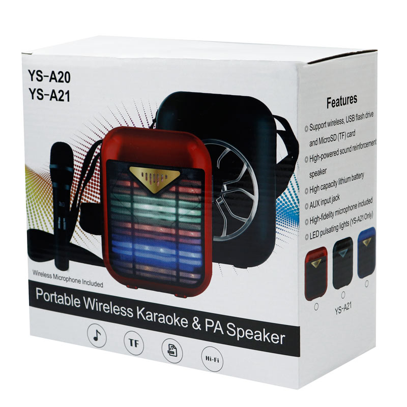 اسپیکر مدل YS-A20 یوسو با طراحی جذاب و ابعاد نسبتا جمع و جوری ساخته شده است که از کیفیت پخش صدای مطلوبی برخوردار می باشد. متریال مرغوبی در ساخت این اسپیکر استفاده شده که آن را در برابر آسیب هایی نظیر ضربه، فشار و … مقاوم کرده است. یک بند نیز بر روی بدنه این دستگاه پخش کننده متصل شده تا حمل و جابجایی راحت تری داشته باشید. اتصال بی سیم اسپیکر رم و فلش خور یوسو از طریق بلوتوث نسخه ۴٫۱ تا شعاع ۱۰ متری بدون هیچ مشکلی به گوشی های موبایل، تبلت و … انجام می شود. اتصال با سیم آن نیز به وسیله رابط جک صوتی ۳٫۵ میلی متری برقرار می شود، همچنین توسط درگاه USB و شیار کارت حافظه تعبیه شده شما قادرید با اتصال فلش مموری و رم میکرو اس دی نیز به فایل های صوتی خود دسترسی و آنها را پخش نمایید. اسپیکر بلوتوثی رم و فلش خور So.Yoso YS A20 با توان ۷ وات، پاسخ فرکانسی در رنج داینامیکی ۶۰ هرتز تا ۲۰ کیلو هرتز و حساسیت سیگنال به نویز ۸۰ دسی بل، قادر است صدای قدرتمند استریو با ضوح فراگیر و بیس بالا را حتی در مکان های پر سروصدا پخش کند. مجهز شدن این اسپیکر به ورودی میکروفون از ویژگی های مهم این اسپیکر می باشد که این دستگاکه را به یک کارائوکه کوچک تبدیل می کند و امکان ضبط صدا، استفاده در مصاحبه، سخنرانی، همخوانی با آهنگ ها و … را در اختیار کاربر قرار می دهد. همچنین اسپیکر مذکور از رادیو FM نیز پشتیبانی می کند که با دریافت سیگنال کانال مورد نظر، می توانید برنامه های رادیویی دلخواه خود را با صدایی شفاف و بدون نویز گوش دهید. این اسپیکر قابل حمل بلوتوثی دارای باتری داخلی ۲۴۰۰ میلی آمپر ساعتی می باشد که ماندگاری شارژ آن برای استفاده مداوم حداکثر ۲ ساعت دوام می آورد و شارژ کردن خود اسپیکر نیز در مدت زمان حدود ۲ تا ۳ ساعت طول می کشد.