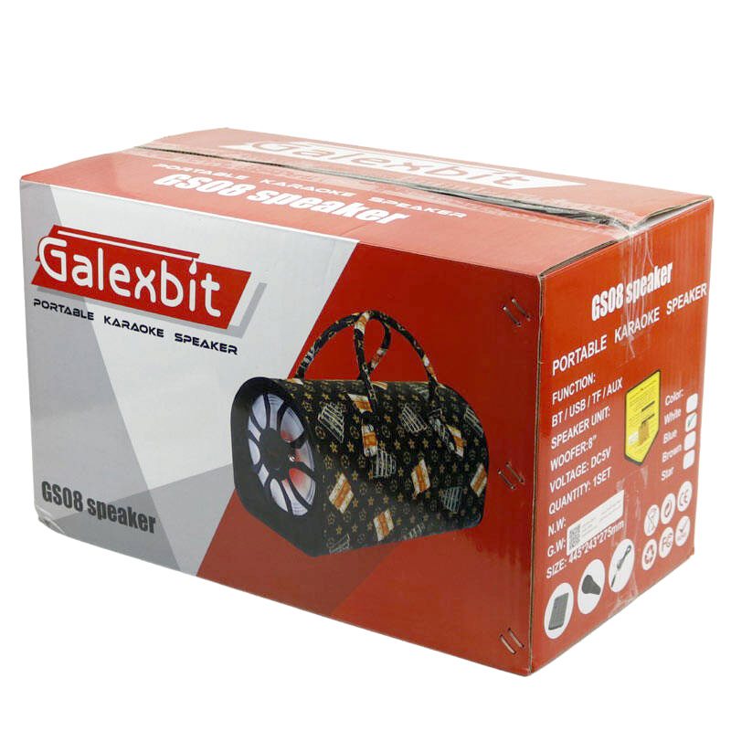 اسپیکر مدل GS-08 به شکل کیف طراحی شده و یکی از محصولات خوش ساخت برند گلکسبیت می باشد. بدنه مقاوم محصول از پلاستیک با کیفیت و چرم مصنوعی در چندین طرح متفاوت ساخته شده است. اسپیکر جهت برقراری ارتباط بی سیم با سایر دستگاه ها دارای بلوتوث داخلی بوده و برد آن به حدود ۱۰ متر می رسد. علاوه بر این توسط رابط جک ۳٫۵ میلی متری صدایی که روی بدنه وجود دارد می توان به صورت با سیم از بلندگو استفاده نمود. حتی می توان آهنگ های مورد علاقه خود را به فلش مموری یا کارت حافظه میکرو اس دی انتقال داد و سپس آن ها را به اسپیکر متصل کرد. این دستگاه از قابلیت کارائوکه (هم خوانی با آهنگ) نیز پشتیبانی می کند و می توان میکروفون همراه را توسط کابل ارائه شده به ورودی مخصوص روی اسپیکر وصل کرد.