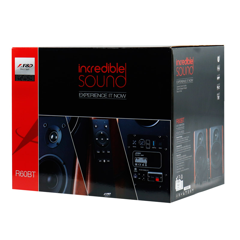 اسپیکر دسکتاپ F&D R60BT با دو عدد بلندگو با توان خروجی کلی ۱۲۰ وات همراه با ساب ووفر ۵٫۲۵ اینچی و توییتر ۱ اینچی قادر است صدایی استریو را پخش کند و جزئیات کامل طیف وسیعی از صداهای زیر و بم را با تکنولوژی HiFi در محدوده فرکانسی ۲۰ هرتز تا ۲۰ کیلوهرتز با حساسیت سیگنال به نویز ۸۲ دسی بل به گوش برساند. بر روی بدنه اسپیکر دو تکه R60BT، کلید چرخشی جهت تنظیم میزان ولوم و دکمه روشن و خاموش کردن دستگاه قرار گرفته است، همچنین این اسپیکر به ریموت کنترل نیز مجهز شده که استفاده راحت تر و اعمال تنظیمات از راه دور برای کاربران امکانپذیر باشد. منبع انرژی مورد نیاز اسپیکر دسکتاپ بی سیم از طریق برق شهری با ولتاژ ۲۲۰ تا ۲۴۰ ولت تامین می شود.