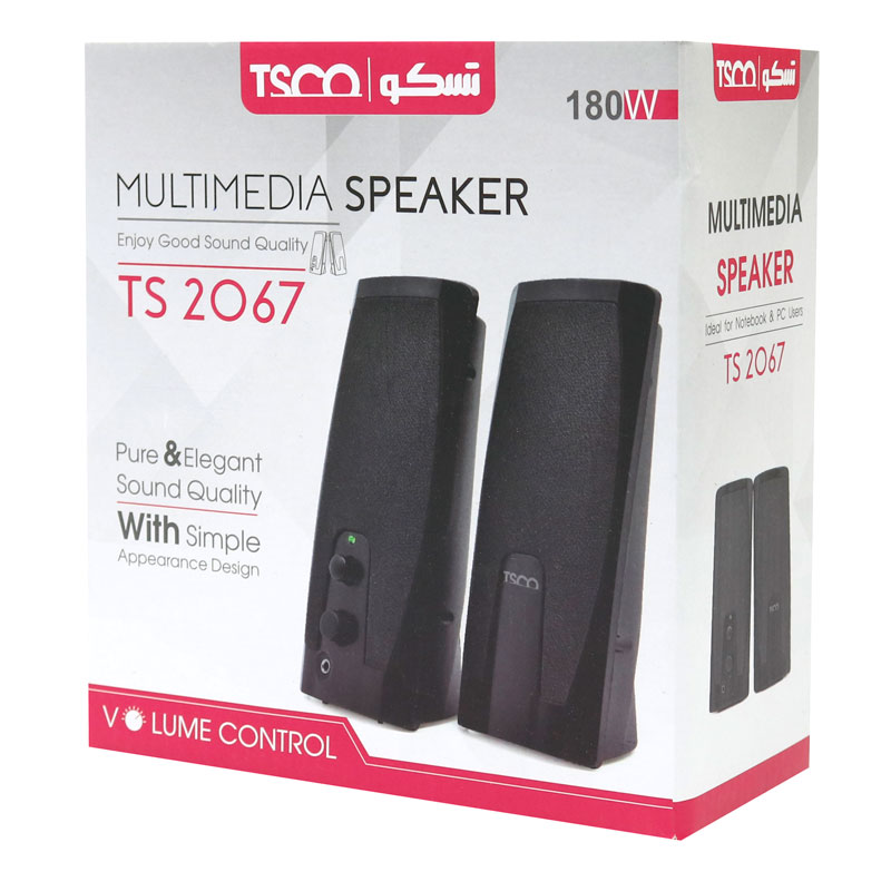 اسپیکر دسکتاپی مدل TS 2067 یکی از محصولات خوش ساخت شرکت تسکو می باشد و کیفیت صدای مطلوبی را در هنگام شنیدن موسیقی، انجام بازی و تماشای فیلم پخش می کند. برای این اسپیکر، پورت USB و رابط جک صوتی ۳٫۵ میلی متری (AUX) تعبیه شده که امکان اتصال به رایانه، گوشی موبایل، تبلت و … را برقرار خواهد کرد و با دو عدد بلندگو و توان خروجی کلی ۴ وات قادر است در محدوده فرکانسی ۲۰۰ هرتز تا ۲۰ کیلوهرتز و میزان حساسیت سیگنال به نویز ۶۵ دسی بل، صدایی قدرتمند، رسا با بیس عالی را به گوش برساند. این دو بلندگو همزمان می توانند صدای استریو قوی و شفافی را با تمام جزئیات زیر و بم پخش کنند که کاربر از تماشای فیلم و یا شنیدن آهنگ مورد علاقه خود لذت ببرد. اسپیکر دو تکه TSCO TS 2067 برای تامین انرژی به پورت USB مجهز شده است تا گزینه های زیادی از طریق درگاه های لپ تاپ، کامپیوتر، پاوربانک و … برای روشن بودن این دستگاه در اختیار کاربر باشد. نشانگر LED و دکمه روشن خاموش و همچنین یک دکمه چرخشی جهت تنظیم میزان حجم صدا بر روی بدنه تعبیه شده است.