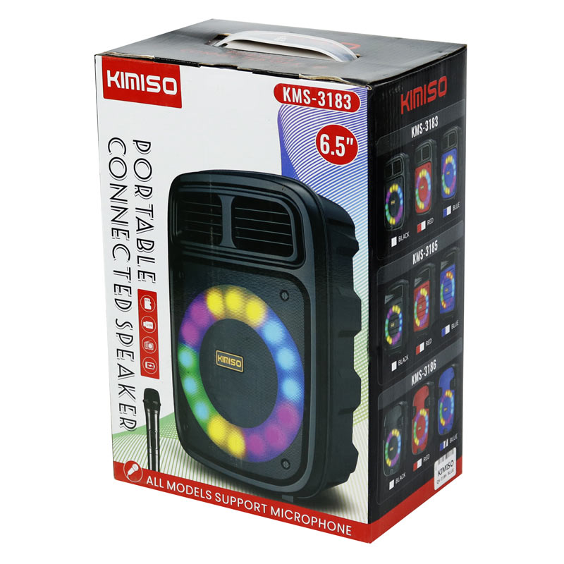 اسپیکر چمدانی KMS3186 ساخت شرکت کیمیسو می باشد و در قسمت بالایی اسپیکر یک دسته به منظور حمل و نقل راحت تر تعبیه شده است. این اسپیکر بلوتوثی جهت زیباتر کردن فضای موجود به نورپردازی داخلی مجهز می باشد و به همین علت در مکان هایی با نور کم کاربرد دارد. Kimiso KMS-3186 در قسمت پشتی خود دارای یک پنل با دکمه های فیزیکی به منظور کنترل مدیریت موسیقی در حال پخش، میزان ولوم و تغییر Mood می باشد. اتصال بی سیم به این اسپیکر از طریق بلوتوث نسخه ۵٫۰ با برد موثر ۱۰ متری بدون وجود قطعی موسیقی امکان پذیر است. همچنین اسپیکر علاوه بر اتصال بی سیم قابلیت اتصال با سیم به کامپیوتر و لپ تاپ از طریق رابط جک ۳٫۵ میلی متری صدا را دارد و کاربر با استفاده از شیار کارت حافظه رم میکرو SD و فلش مموری USB می تواند به راحتی به موسیقی و فایل های صوتی ذخیره شده دسترسی پیدا کند. نکته دیگر لازم به ذکر پشتیبانی اسپیکر KMS3186 از سه استاندارد CE/ FCC/ RoHS مرتبط با سلامت و ایمنی محصول می باشد. پخش کننده موسیقی کیمیسو از یک باتری داخلی به ظرفیت ۱۵۰۰ میلی آمپر ساعت تغذیه می کند. در صورت اتمام شارژ اسپیکر کاربر به سادگی می تواند با استفاده از پورت میکرو یو اس بی و کابل مربوطه دستگاه را در مدت زمان حدودا ۲ ساعت شارژ نماید و بعد از شارژ شدن کامل حدود ۲ تا ۳ ساعت به طور مداوم به پخش موسیقی بپردازد. در کنار کمه های فیزیکی پورت میکروفون جهت ورود میکروفون همراه و استفاده از قابلیت کارائوکه در نظر گرفته شده است که هم خوانی با اهنگ در حال پخش را به کاربر هدیه می دهد. این اسپیکر چمدانی می تواند با داشتن درایو ۶٫۵ اینچی، توان خروجی کلی ۶ وات و فرکانس پاسخ گویی در محدوده ۲۰ هرتز الی ۲۰ کیلوهرتز صدایی با قدرت و با تمام جزئیات در هر سبک موسیقی را به گوش کاربران برساند. همچینن کیمسیو این پخش کننده صدا را به رادیو FM مجهز کرده است تا علاقه مندان، پخش برنامه های دلخواه با صدایی شفاف و قدرتمند را تجربه نمایند.
