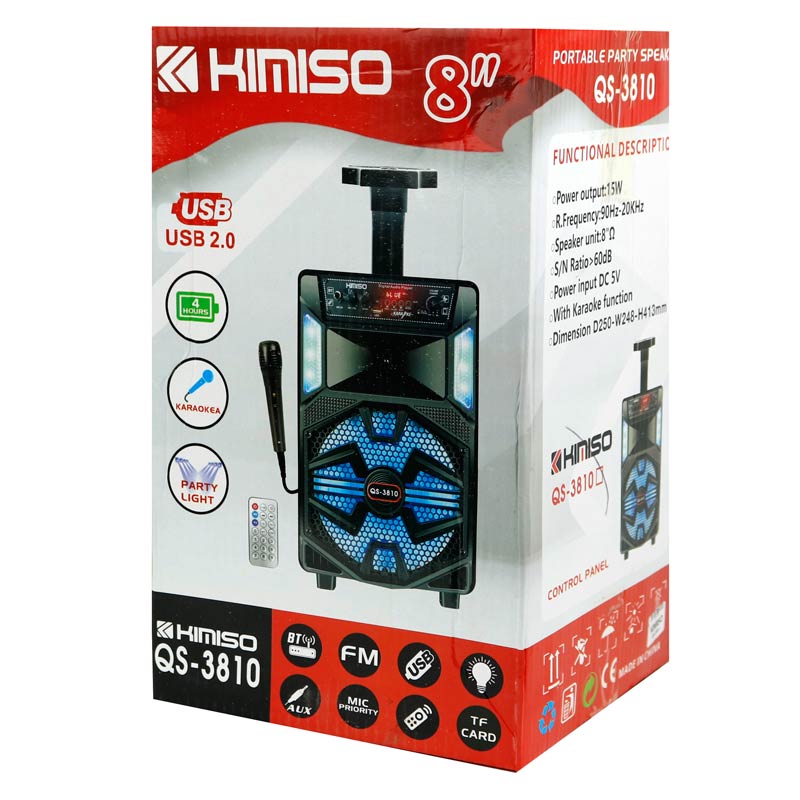 اسپیکر چمدانی مدل QS-3810 از برند کیمیسو با بدنه ای مقاوم و از متریال باکیفیت ساخته شده است که استحکام کافی را در برابر ضربه، فشار و دیگر آسیب ها نشان می دهد. یک دسته با قابلیت تاشو در قسمت بالای بدنه و چرخ هایی در بخش زیرین نیز در نظر گرفته شده تا حمل و جابجایی با سهولت بیشتری برای کاربر فراهم باشد. این اسپیکر از درایو به قطر ۸ اینچی برخوردار است که با میزان قدرت ۱۵ وات امکان پخش صدای باوضوح فراگیر و استریو را براساس حساسیت سیگنال به نویز ۶۰ دسی بل در دامنه فرکانسی ۹۰ هرتز تا ۲۰ کیلوهرتز با بیس بالا به گوش می رساند. اتصال این دستگاه پخش کننده صوتی به صورت بی سیم توسط بلوتوث به انواع گوشی موبایل، تبلت و دیگر گجت ها تا شعاع ۱۰ متری بدون افت کیفیت و قطعی برقرار می شود. رابط جک صوتی ۳٫۵ میلی متری (AUX)، پورت USB فلش مموری و شیار کارت حافظه رم میکرو SD نیز بر روی بدنه تعبیه شده است تا قابلیت دسترسی به پخش مستقیم دیگر فایل های ذخیره شده نیز برای کاربر وجود داشته باشد. اسپیکر چمدانی بلوتوثی رم و فلش خور QS-3810 به ورودی میکروفون مجهز است که قابلیت کارائوکه را با امکان خواندن آواز، همخوانی با موسیقی در حال پخش و … از طریق اتصال میکروفون همراه به این دستگاه ارائه می دهد. محفظه ای نیز در پنل پشتی اسپیکر برای قرار دادن میکروفون وجود دارد که برای حمل و جابجایی این ابزار کاربردی می باشد. نورپردازی داخلی هم به منظور افزایش زیبایی و جذابیت در هنگام گوش دادن به موسیقی در مکان هایی با نور کم فراهم شده است. QS-3810 مجهز به رادیو FM نیز است و برنامه های رادیویی را با صدای شفاف و بدون نویز پخش خواهد کرد. تامین انرژی این دستگاه از طریق باتری داخلی تامین می شود که از میزان ماندگاری حدود ۴ ساعت هنگام استفاده مدوام برخوردار می باشد و پس از اتمام انرژی از طریق پورت میکرو یو اس بی قابل شارژ مجدد خواهد بود. نمایشگر LED به منظور نمایش اطلاعات و تعدادی کلید فیزیکی جهت مدیریت موسیقی، میزان ولوم، Mode و … بر روی بدنه تعبیه شده است. همراه اسپیکر قابل حمل QS3810 یک ریموت برای کنترل مدیریت و تنظیمات مختلف پخش موسیقی از راه دور نیز قرار دارد.