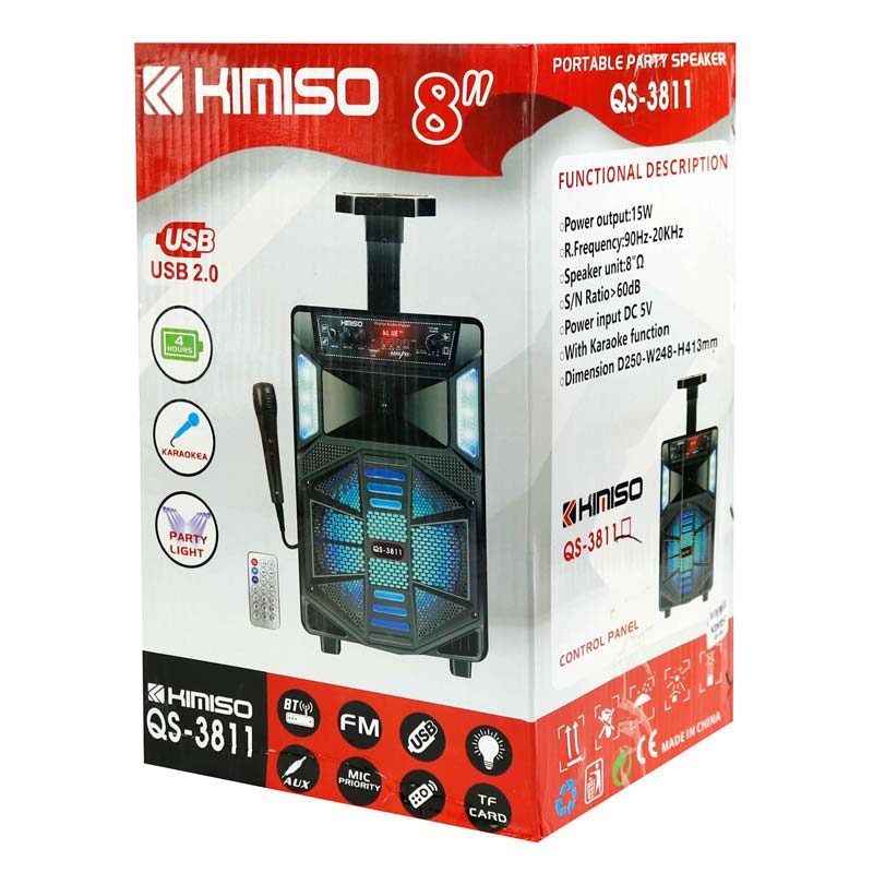 اسپیکر بی سیم QS3811 یکی از محصولات شرکت کیمیسو است که در فرم چمدانی ارائه شد. بر روی قسمت بالایی بدنه این اسپیکر یک دسته تاشو و در بخش زیرین چرخ هایی جهت جا به جایی آسان تر محصول وجود دارد. بر روی قسمت جلویی اسپیکر چند دکمه فیزیکی به منطور کنترل و مدیریت بهتر موسیقی، میزان ولوم و Mood طراحی شده است، همچنین در قسمت بالایی دکمه ها یک نمایشگر LED جهت نمایش وضعیت موسیقی در حال پخش قرار دارد. اتصال بی سیم به این اسپیکر از طریق بلوتوث نسخه ۵٫۰ با اتصال پایدار ۱۰ متری بدون قطعی انجام می گیرد. اتصال این اسپیکر به کامپیوتر و لپ تاپ به صورت باسیم از طریق رابط جک ۳٫۵ میلی متری صدا قابل اجرا بوده و دسترسی به فایل های صوتی ذخیره شده نیز با وجود شیار کارت حافظه رم Micro SD و پورت فلش مموری USB برای کاربر امکان پذیر است. QS-3811 با پشتیبانی از رادیو FM مناسب استفاده کاربران علاقه مند به برنامه های رادیویی نیز خواهد بود. اسپیکر Kimiso QS-3811 انرژی مورد نیاز خود را از طریق باتری داخلی با ظرفیت ۱۵۰۰ میلی آمپر ساعت تامین می کند که با استفاده از کابل میکرو یو اس بی در مدت زمان کم قابلیت شارژ مجدد را دارد و در حالت شارژ کامل قادر است تا ۴ ساعت به طور مداوم به پخش موسیقی بپردازد. اسپیکر کیمیسو با بهره مندی از درایوی به قطر ۸ اینچ، توان خروجی کلی ۱۵ وات، پاسخ فرکانسی در رنج داینامیکی ۹۰ هرتز الی ۲۰ کیلوهرتز و حساسیت سیگنال به نویز ۶۰ دسی بل قادر است صدایی فاف و واضح را هنگام پخش انواع فایل صوتی را به گوش برساند. همچنین دارای یک ریموت کنترل است تا در مواقع دور بودن کاربر از اسپیکر چمدانی با فشردن دکمه مورد نظر بتواند تنظیمات مورد نظر خود را انجام دهد. یک میکروفون همراه QS3811 وجود دارد و پورت ورودی MIC نیز بر روی بدنه محصول جهت همخوانی با آهنگ مورد علاقه و لذت هرچه بیشتر کاربران تعبه شده است.