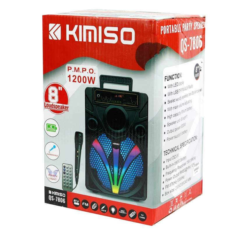 اسپیکر قابل حمل کیمیسو مدل QS-7806 از متریال باکیفیت و مقاوم در ساخت بدنه بهره برده و توسط دستگیره ای که بر روی آن تعبیه شده امکان جابجایی راحت تری برای کاربر فراهم شده است. این اسپیکر از طریق بلوتوث به صورت بی سیم امکان برقراری ارتباط با دستگاه های مختلف نظیر گوشی موبایل، تبلت و … را تا شعاع ۱۰ متری با پخش پایدار صدا و موسیقی خواهد داشت. همچنین رابط جک صوتی ۳٫۵ میلی متری جهت اتصال به دستگاه های فاقد بلوتوث و نیز شیار کارت حافظه و پورت USB به منظور استفاده از رم میکرو SD و فلش مموری برای دسترسی به فایل های صوتی ذخیره شده نیز وجود دارد. درایور ۸ اینچی این اسپیکر با توان خروجی ۳۰۰ وات قادر است صدایی قوی و شفاف با وضوح مناسب را به صورت استریو در دامنه فرکانسی ۱۵۰ هرتز تا ۱۸ کیلوهرتز و با تمام جزئیات زیر و بم موسیقی به گوش برساند. نورپردازی داخلی در بخش بلندگو این دستگاه وجود دارد که با ایجاد جلوه بصری زیبا در مهمانی های شبانه و … مدرن بودن آن را نشان می دهد. اسپیکر چمدانی بلوتوثی رم و فلش خور Kimiso QS-7806 به پورت ورودی میکروفون نیز مجهز شده است که در صورت متصل نمودن میکروفون همراه عملیاتی مانند ضبط صدا، سخنرانی، همخوانی با آهنگ، تمرین آواز خواندن و … با قابلیت کارائوکه فعال می شود. یک شیار در قسمت پشتی بدنه به منظور قرارگیری میکروفون در نظر گرفته شده تا این ابزار در دسترس کاربر باشد. علاوه بر این اسپیکر کیمیسو از دریافت امواج رادیو FM در بازه فرکانسی ۸۷ الی ۱۰۸ مگاهرتز پشتیبانی نموده و برنامه های رادیویی را با صدایی بدون نویز پخش خواهد کرد. فناوری TWS از ویژگی های کاربردی QS7806 می باشد که اتصال همزمان ۲ اسپیکر مشابه را به یک دستگاه بلوتوثی فراهم می کند تا بتوان صدایی چند برابر قوی تر از پخش موسیقی را شنید. انرژی مورد نیاز توسط باتری داخلی تامین می شود که حدود ۴ ساعت دوام شارژ دارد و عملیات شارژ مجدد نیز از طریق پورت میکرو یو اس بی به راحتی قابل انجام می باشد. ریموت کنترل برای انجام تنظیمات راه دور همراه QS 7806 بوده و نمایشگر LED و کلیدهای فیزیکی به منظور روشن و خاموش کردن، مدیریت موسیقی، تنظیم ولوم و … همراه با پنل حرفه ای تنظیم صدا بر روی بدنه تعبیه شده است.