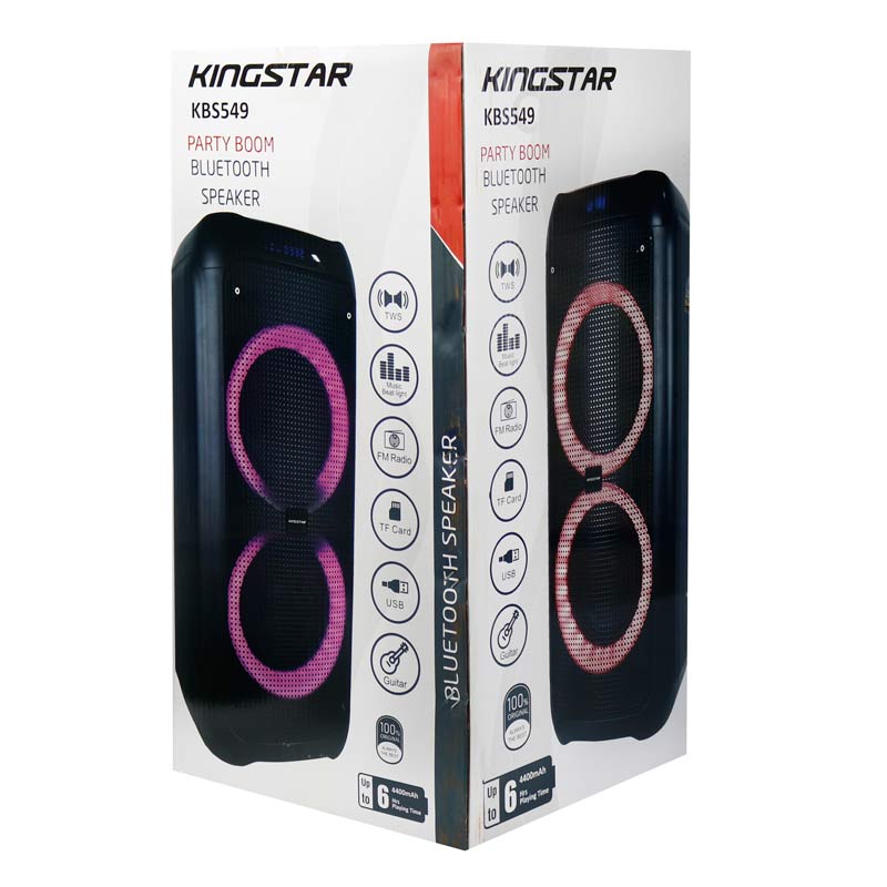 اسپیکر بلوتوثی قابل حمل کینگ استار مدل KingStar KBS549 با بدنه ای از مواد مرغوب و مقاوم ساخته شده است که استحکام کافی را در برابر آسیب ها مانند ضربه و فشار خواهد داشت. این پارتی بوم توسط بلوتوث نسخه ۵٫۰ به صورت بی سیم به گجت های مختلف مانند گوشی موبایل، تبلت و … متصل می شود و قادر است تا برد ۱۰ متری صدای قدرتمندی را برای جشن ها و مهمانی ها حتی در محیط باز پخش نماید. دو درایو ۸ اینچی با توان خروجی کلی ۴۰ وات با قدرت بالایی امکان پخش صدای استریو با وضوح فراگیر همراه با بیس عالی را در دامنه فرکانسی ۱۰۰ هرتز تا۲۰ کیلوهرتز را فراهم خواهند کرد. اسپیکر پرتابل KBS549 به نورپردازی رنگی داخلی نیز در قسمت بلندگو مجهز شده که جذابیت و مدرن بودن این دستگاه را هنگام پخش موسیقی دوچندان می کند.