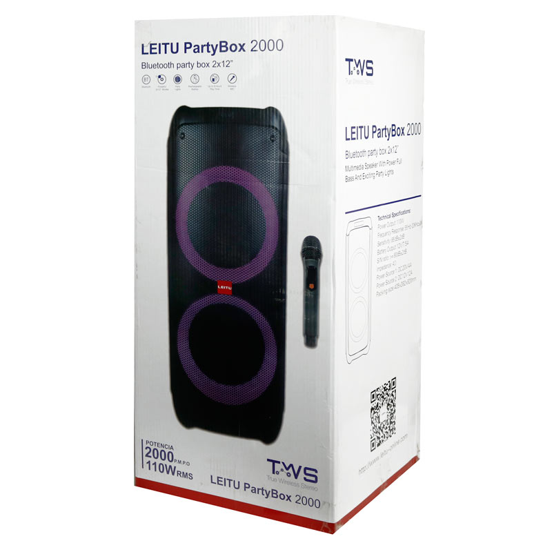 اسپیکر چمدانی Leitu مدل Party Box 2000 در ابعاد و اندازه بزرگ و بدنه ای محکم از مواد مرغوب ساخته شده است که مقاومت بالایی را در برابر آسیب هایی نظیر ضربه و فشار از خود نشان می دهد. این اسپیکر از کیفیت پخش صدای قدرتمندی برای جشن ها، مهمانی ها به خصوص در محیط باز و شلوغ برخوردار می باشد. دو درایو قدرتمند ۱۲ اینچی این پارتی باکس با توان خروجی معادل ۱۱۰ وات امکان شنیدن صدا ها را با Loudness یا بلندی قابل قبول و کیفیت خوب خواهد داد. این اسپیکر قادر است صدایی رسا و استریو را در محدوده فرکانسی ۵۵ هرتز تا ۲۰ کیلوهرتز با حساسیت سیگنال به نویز ۸۵ دسی بل و امپدانس ۴ اهم با وضوحی فراگیر به گوش کاربر برساند. اسپیکر بی سیم و قابل حمل Leitu از دریافت امواج رادیو FM و پخش برنامه های رادیویی با صدایی بدون نویز پشتیبانی می کند و همچنین دارای نورپردازی داخلی در هنگام پخش موسیقی می باشد. نمایشگر LED و پنلی از دکمه های فیزیکی جهت مدیریت موسیقی، تنظیم ولوم، رکورد و … بر روی بدنه آن تعبیه شده و یک ریموت کنترل نیز همراه آن قرار دارد تا از راه دور این تنظیمات نیز برای کاربر امکان پذیر باشد. انرژی این اسپیکر بلوتوثی از طریق باتری داخلی Lead-Acid با ظرفیت ۷۵۰۰ میلی آمپر ساعت و میزان شارژدهی تا حدود ۵ ساعت با حجم ولوم ۵۰ درصد تامین می شود، شارژ مجدد باتری نیز به وسیله آداپتور مخصوص قابل انجام می باشد.