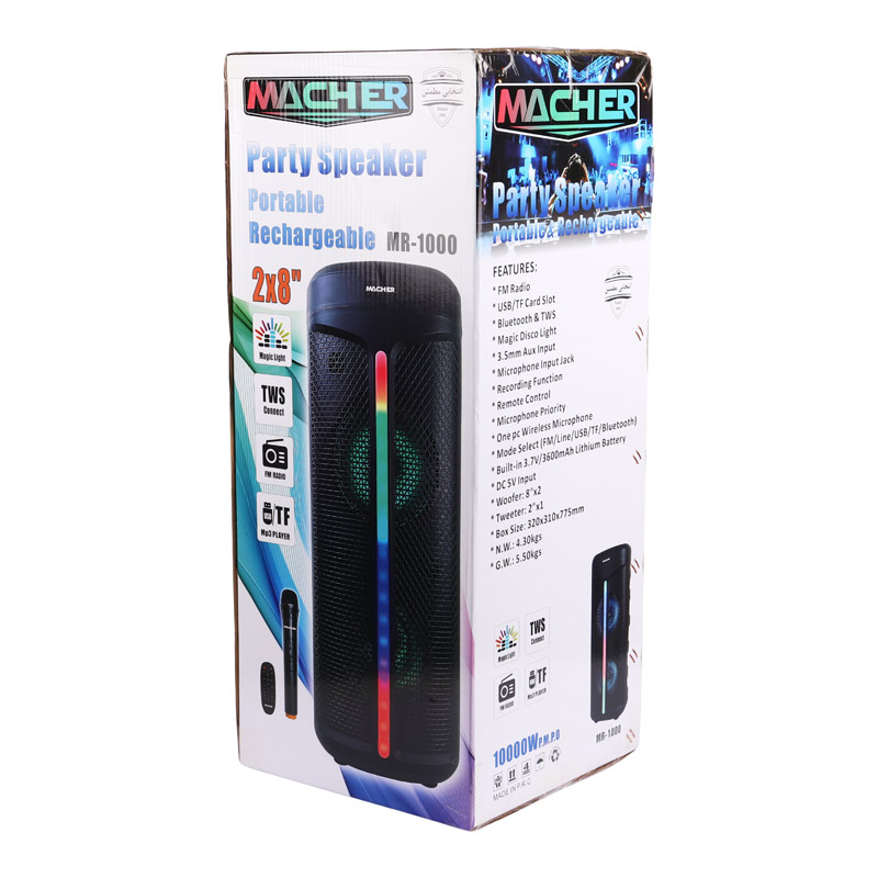 اسپیکر چمدانی بلوتوثی رم و فلش خور Macher MR-1000 + میکروفون و ریموت کنترل