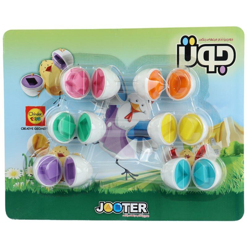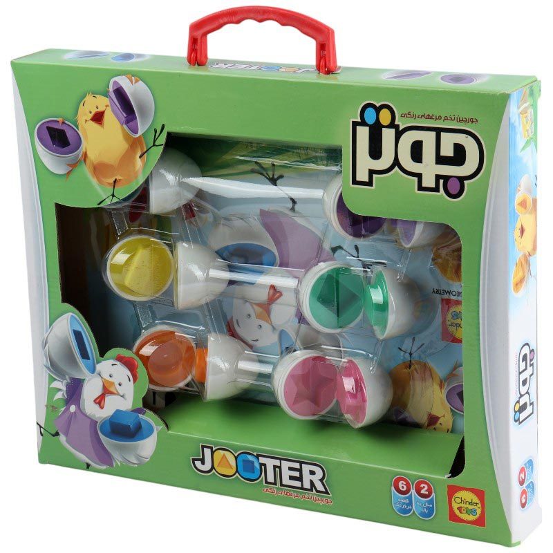 بازی جوتر(جورچین تخم مرغ های رنگی) دارای 6 تخم مرغ بوده که از وسط نصف شده و در یک نیمه حجمی بر آمده و در نیمه دیگر به اندازه ی حجم برآمده فرو رفتگی، وجود دارد تا کودک با شناسایی رنگ های مشابه سعی در چفت کردن نیمه ها به هم کند.