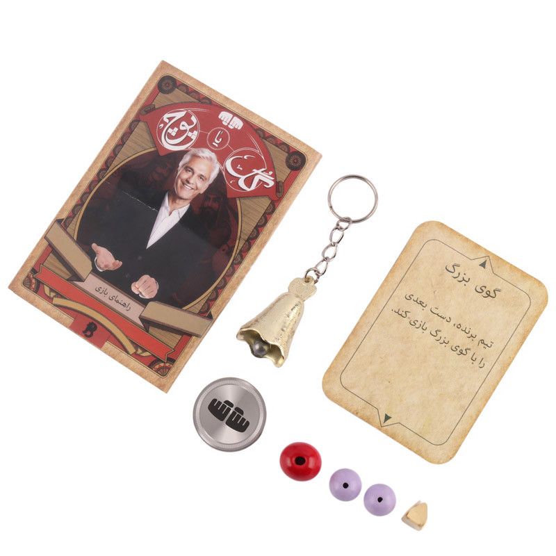محتویات پکیج شامل 18 کارت بازی، گوی صدادار، گوی کوچک، گوی بزرگ، دستور بازی، زنگ و سکه