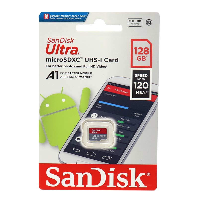 حافظه رم میکرو سن دیسک مدل Ultra از کلاس ۱۰ و ظرفیت ۱۲۸ گیگابایت پشتیبانی می کند. سرعت خواندن این کارت حافظه در حدود ۱۲۰ مگابایت بر ثانیه است که برای ذخیره سازی اطلاعات سنگین و پرحجمی چون فیلم، موسیقی و دیگر فایل های با کیفیت همچون Full HD بسیار مناسب می باشد و در مدت زمان کمی، بدون هیچ مشکلی می توانید به تماشا، ضبط و ذخیره دیتاهای خود بپردازید. رم میکرو SanDisk در برابر ضربه، دمای بالا، رطوبت، شوک، اشعه ایکس و دیگر آسیب ها مقاومت بالایی از خود نشان می دهد تا کاربر نگرانی از بابت به خطر افتادن اطلاعات و داده های خود نداشته باشد.