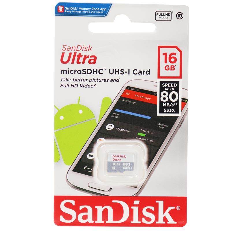 برند سندیسک سازنده انواع کارت حافظه جانبی با کیفیت و قیمت مناسب بوده که یکی از مدل های آن سری Ultra مدل ۵۳۳X با استاندارد U1 می باشد. رم میکرو مدل ۵۳۳X دارای ظرفیت ۱۶ گیگابایت بوده و می تواند به راحتی تمام فایل و اطلاعات کاربر شامل عکس، فیلم، موسیقی و … را ذخیره نماید. این رم قادر به خواندن اطلاعات با سرعت ۸۰ مگابایت بر ثانیه در زمان بسیار کوتاهی است تا کاربر بتواند به سرعت به اطلاعات مورد نظر خود دسترسی داشته باشد، همچنین استاندارد سرعت در رم میکرو اس دی سن دیسک، U1 و کلاس ۱۰ می باشد. این کارت حافظه قابلیت نصب بر روی گوشی تلفن همراه، تبلت، دوربین دیجیتال و سایر دستگاه های دارای درگاه میکرو اس دی را دارا است. جنس بدنه این محصول مقاوم و دارای استاندارد ساخت FCC/ CE بوده که به خوبی از اطلاعات کاربر محافظت و نگهداری می کند. علاوه بر این، برای نگهداری و تماشای ویدئوهای Full HD نیز کاملا سازگار بوده و قابلیت پشتیبانی از رزولوشن Full HD را دارد.