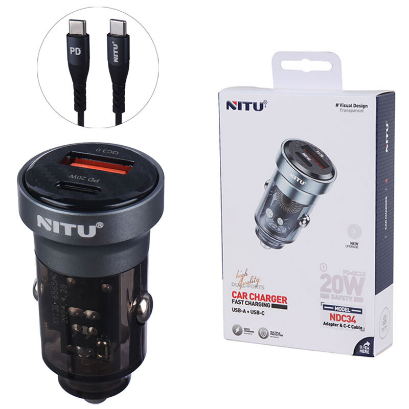 شارژر فندکی فست شارژ خودرو Nitu مدل NDC34 با توان خروجی 20 وات به همراه کابل تایپ سی