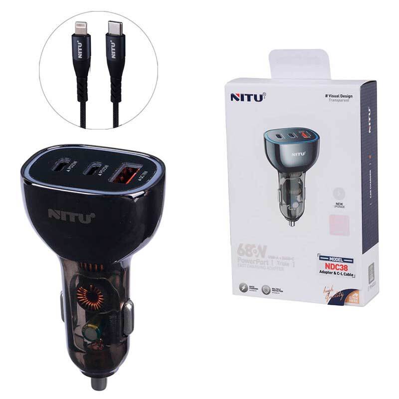 شارژر فندکی فست شارژ خودرو Nitu مدل NDC38 با توان خروجی 25 وات به همراه کابل لایتنینگ به تایپ سی