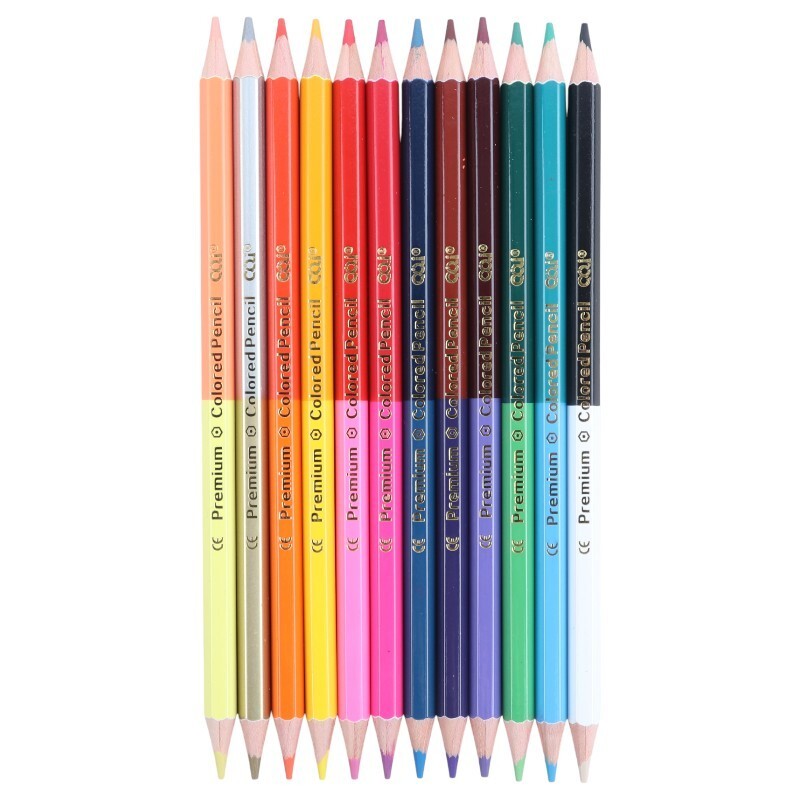 در بسته بندی مقوایی، تشکیل شده از 12 عدد مداد رنگی به صورت 2 رنگ در دو طرف یک مداد