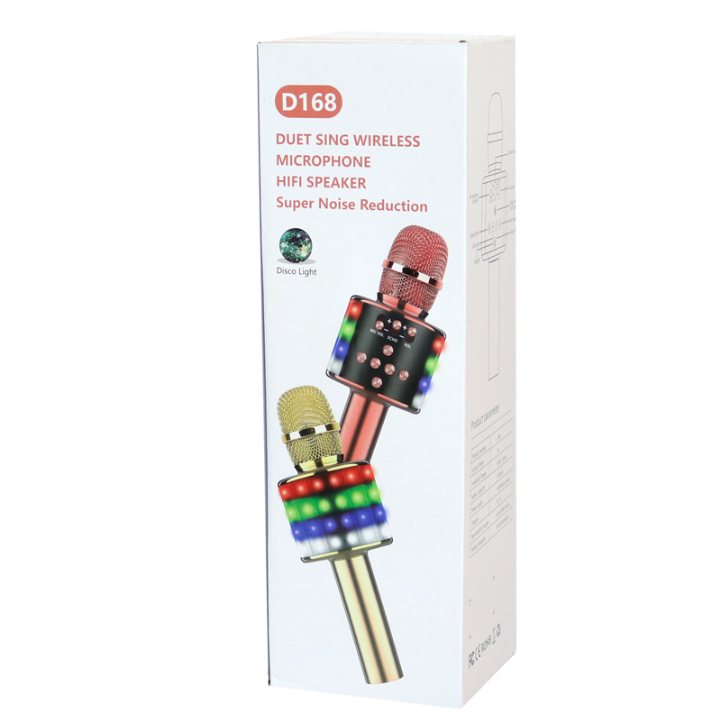 میکروفون اسپیکر D18 از بدنه ای خوش ساخت با طراحی زیباتشکیل شده است که مقاومت مناسبی را در برابر ضربه، فشار و دیگر آسیب ها خواهد داشت. این دستگاه کارائوکه کوچک از طریق بلوتوث به گوشی موبایل، لپ تاپ و دیگر دستگاه های سازگار متصل می شود و با اتصالی پایدار به پخش صدا باکیفیت مطلوب می پردازد. همچنین رابط جک صوتی ۳٫۵ میلی متری (AUX) و درگاه کارت حافظه رم میکرو SD نیز برای این محصول تعبیه شده تا روش های دسترسی مستقیم به فایل های صوتی و آهنگ های مورد علاقه کاربر فراهم باشد. نورپردازی LED زیبایی نیز با رقص نور رنگ های مختلف جلوه و جذابیت بیشتری را در مهمانی، جشن و … به میکروفون اسپیکر پرتابل D-168 می بخشد. باتری ۱۸۶۵۰ لیتیومی با ظرفیت ۱۲۰۰ میلی آمپر وظیفه تامین انرژی این دستگاه پخش کننده صوتی بی سیم را برعهده دارد و شارژدهی آن در استفاده مدوام دارای ماندگاری قابل قبولی بوده و توسط پورت میکرو یو اس بی به راحتی و با صرف زمان محدود شارژ مجدد می شود.