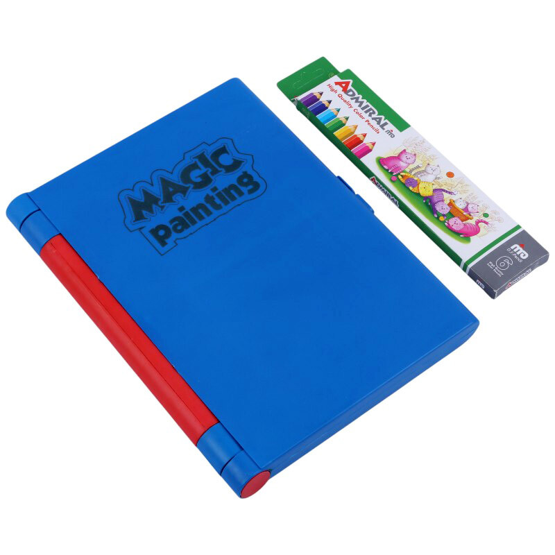 نقاشی جادویی شامل یک صفحهی طلقی پایه دار، یک بسته مداد رنگی، یک مداد و تعدادی طرح رنگی و بیرنگ است.