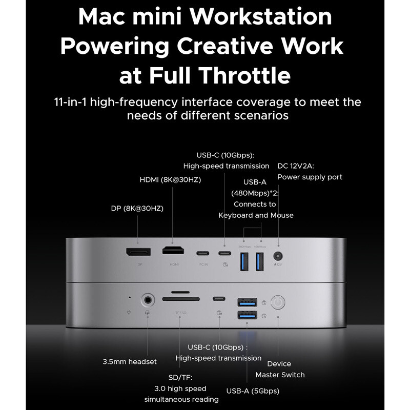 2 عدد USB-A (5Gbps) 2 عدد USB-A (480Mbps) 2 عدد USB-C 2 عدد شیار کارت حافظه SD/TF 1 عدد HDMI 8K@30Hz / 4K@60Hz 1 عدد Display 8K@30Hz / 4K@60Hz 1 عدد جک 3.5 میلی متری صدا