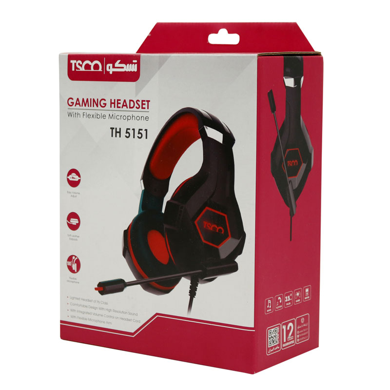 هدست گیمینگ سیم دار TSCO TH5151 دارای میکروفون خارجی انعطاف پذیر با قابلیت چرخش ۱۸۰ درجه ای برای تنظیم بهترین زاویه نزدیک دهان می باشد که با میزان حساسیت ۳۸- دسی بل و امپدانس ۲٫۲ کیلواهم صدایی شفاف و بدون نویز را منتقل می نماید. خروجی صدای این هدست با وجود دو درایو با حساسیت سیگنال به نویز ۱۰۵ دسی بل و امپدانس ۳۲ اهم، صدایی استریو با وضوح فراگیر را در دامنه فرکانسی ۲۰ هرتز تا ۲۰ کیلوهرتز به گوش می رساند. نورپردازی داخلی RGB رنگی نیز برای این هدفون گیمینگ در نظر گرفته شده که در محیط های با نور کم جلوه مدرن و زیبایی را ارائه می دهد و از طریق کابل USB انرژی مورد نیاز برای روشن شدن آن تامین می شود. کلید فیزیکی از نوع چرخشی بر روی سیم رابط AUX قرار دارد تا مدیریت و تنظیم میزان حجم صدا نیز به راحتی در دسترس کاربر باشد.