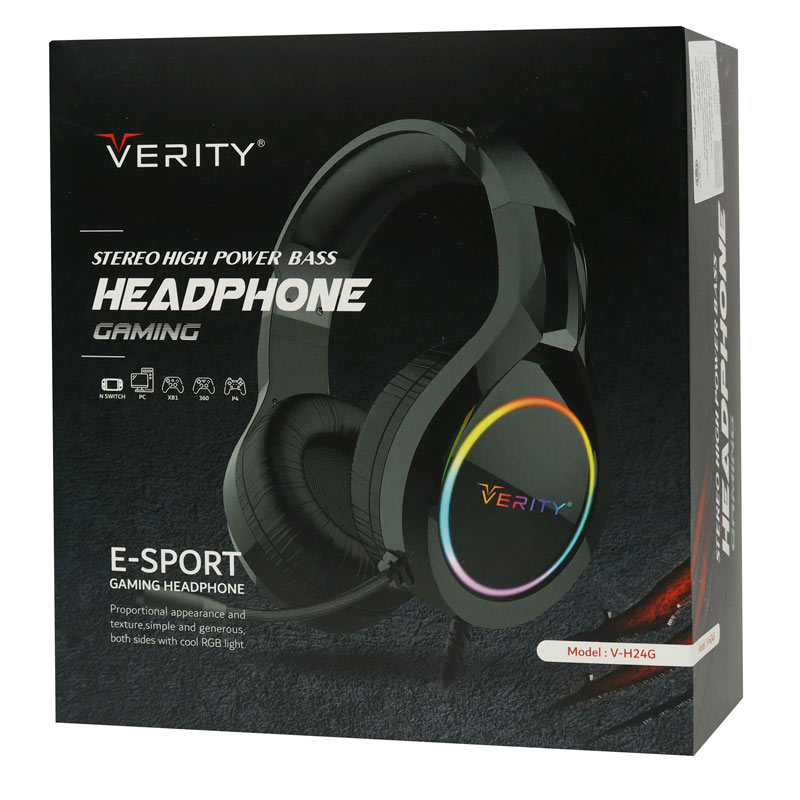 هدفون گیمینگ مدل VH24G از محصولات کمپانی وریتی در عرصه تولیدات لوازم جانبی با کیفیت می باشد که با کیفیت صدای مطلوب خود مناسب استفاده در تماشای فیلم، بازی و گوش دادن به موسیقی خواهد بود. این محصول از دو بالشتک از جنس چرم مصنوعی ساخته شده است که تمام سطح گوش را پوشش می دهد از ورود صدای محیط در هنگام پخش موسیقی یا بازی به داخل هدفون جلو گیری می کند و در استفاده طولانی مدت باعث خستگی گوش کاربر نخواهد شد. این هدفون بر روی سیم رابط خود دارای یک کلید جهت تغییر میزان صدا می باشد. هدست سیم دار گیمینگ وریتی با داشتن قابلیت کم و زیاد کردن ارتفاع به کاربران این امکان را می دهد تا زاویه درست را انتخاب کنند. این هدفون به صورت با سیم از طریق رابط جک ۳٫۵ میلی متری صدا یا همان AUX به کنسول های بازی، گوشی های هوشمند، کامپیوتر و دیگر دستگاه های سازگار متصل می شود. کابل V-H24G دارای روکش با کیفیت از جنس الیاف به هم بافته شده می باشد که در برابر کشیدگی و پارگی از مقاومت خوبی برخوردار است و طول کابل حدود ۲ متر بوده که برای فعالیت گیمینگ بسیار مناسب بوده و محدودیت خاصی ایجاد نمی کند. هدفون سیم دار وریتی انرژی خود را از دستگاهی که به آن متصل می شود به دست می آورد. این محصول دارای یک پورت USB به منظور تامین انرژی برای نورپردازی LED RGB داخلی می باشد. هدفون مخصوص بازی وریتی مدل V-H24G با وجود دامنه پاسخ گویی ۲۰ هرتز تا ۲۰ کیلو هرتز و قطر درایو ۴۰ میلی متری طیف وسیعی از صداهای زیر و بم از هر سبک موسیقی را با وضوح بالا و استریو، بدون تاخیر به گوش کاربر می رساند. میکروفون این هدست با دارا بودن قابلیت چرخش به کاربران این امکان را می دهد تا بهترین زاویه را برای قرار گیری مقابل دهان تنظیم کنند. همچنین برای هدفون قابلیت حذف نویز در نظر گرفته شده تا کاربران به مکالمه ای شفاف بپردازند.