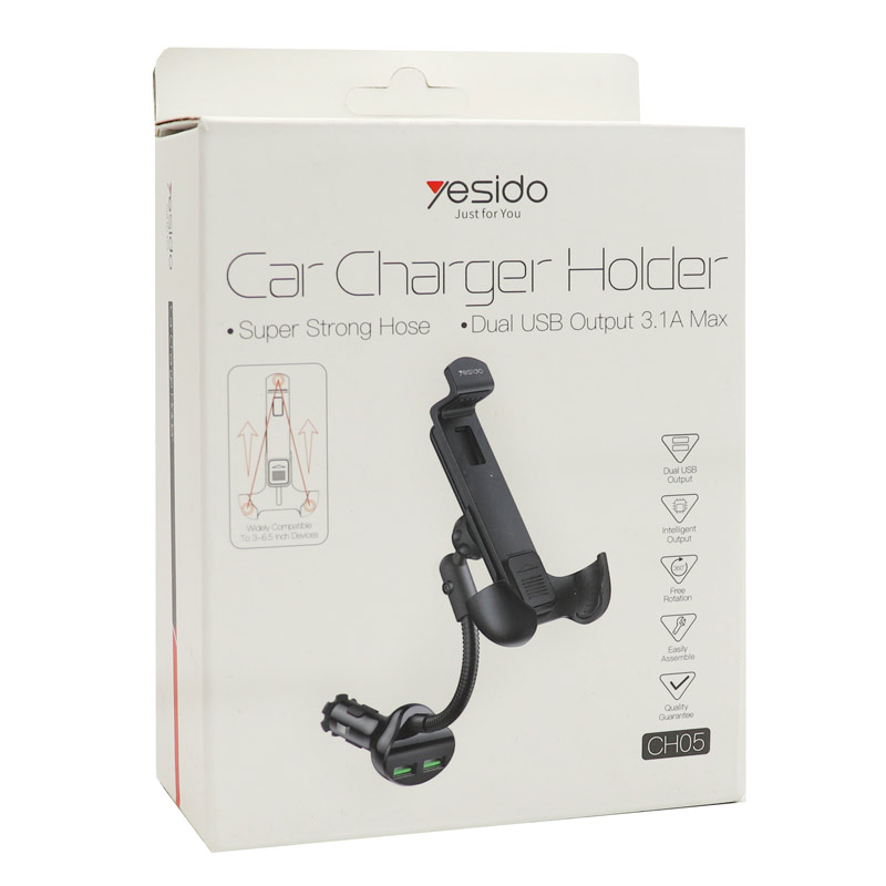 هولدر موبایل CH05 همراه با شارژر فندکی قابل جدا شدن از برند یسیدو مناسب برای شارژ و نگهداری موبایل و استفاده در انواع خودرو می باشد. بدنه این محصول دو کاره از پلاستیک ABS ساخته شده است که مقاومت کافی در برابر حرارت، ضربه و فشار را خواهد داشت. فندکی آن به دو پورت خروجی از نوع USB مجهز می باشد که با حداکثر شدت جریان عبوری ۳٫۱ آمپر دستگاه های هوشمند مانند گوشی موبایل، تبلت و … را در ایمنی و با سرعتی مطلوب شارژ می کند. قسمت هولدر این محصول نیز به کمک براکت های مستحکم، برای نگهداری تلفن همراه ۳ تا ۶٫۵ اینچی مناسب است و با نوارهای سیلیکونی که بر روی گیره ها تعبیه شده از آسیب و خط و خش به قاب گوشی جلوگیری می شود. بازوی انعطاف پذیر، امکان تنظیم طول گیره نگهدارنده جهت متناسب سازی با ابعاد گوشی موبایل و قابلیت چرخش ۳۶۰ درجه سری برای انتخاب بهترین زاویه دید همگی در سهولت استفاده کاربر از هولدر و شارژر فندکی Yesido CH05 هنگام رانندگی موثر خواهند بود.
