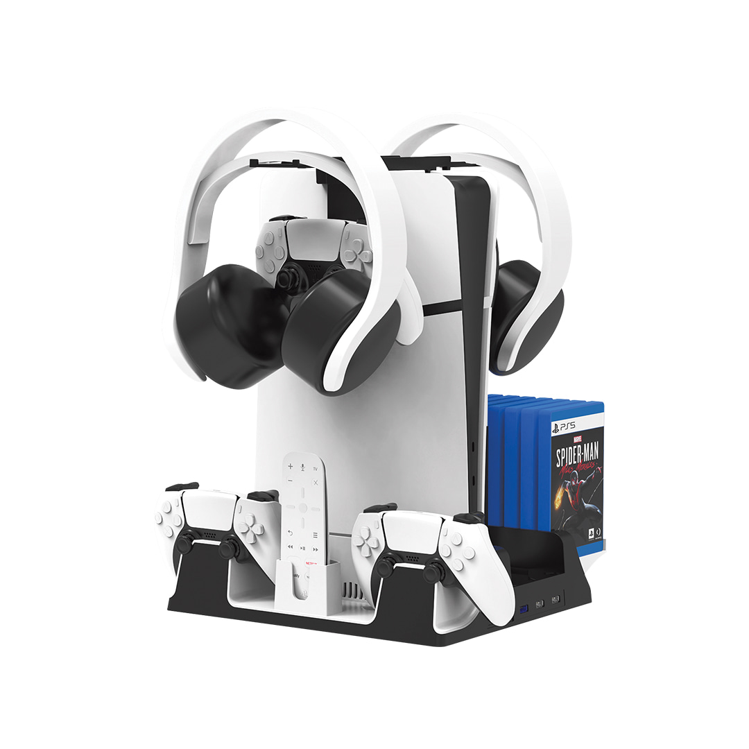 این استند نه تنها کنترلرهای PS5 را همزمان و سریع شارژ میکند، بلکه با داشتن ۱۴ جای دیسک، نگهدارنده دو هدست، سه پورت USB و دو حالت شارژ، تمام تجهیزات گیمینگ را در یک نقطه جمع میکند.
