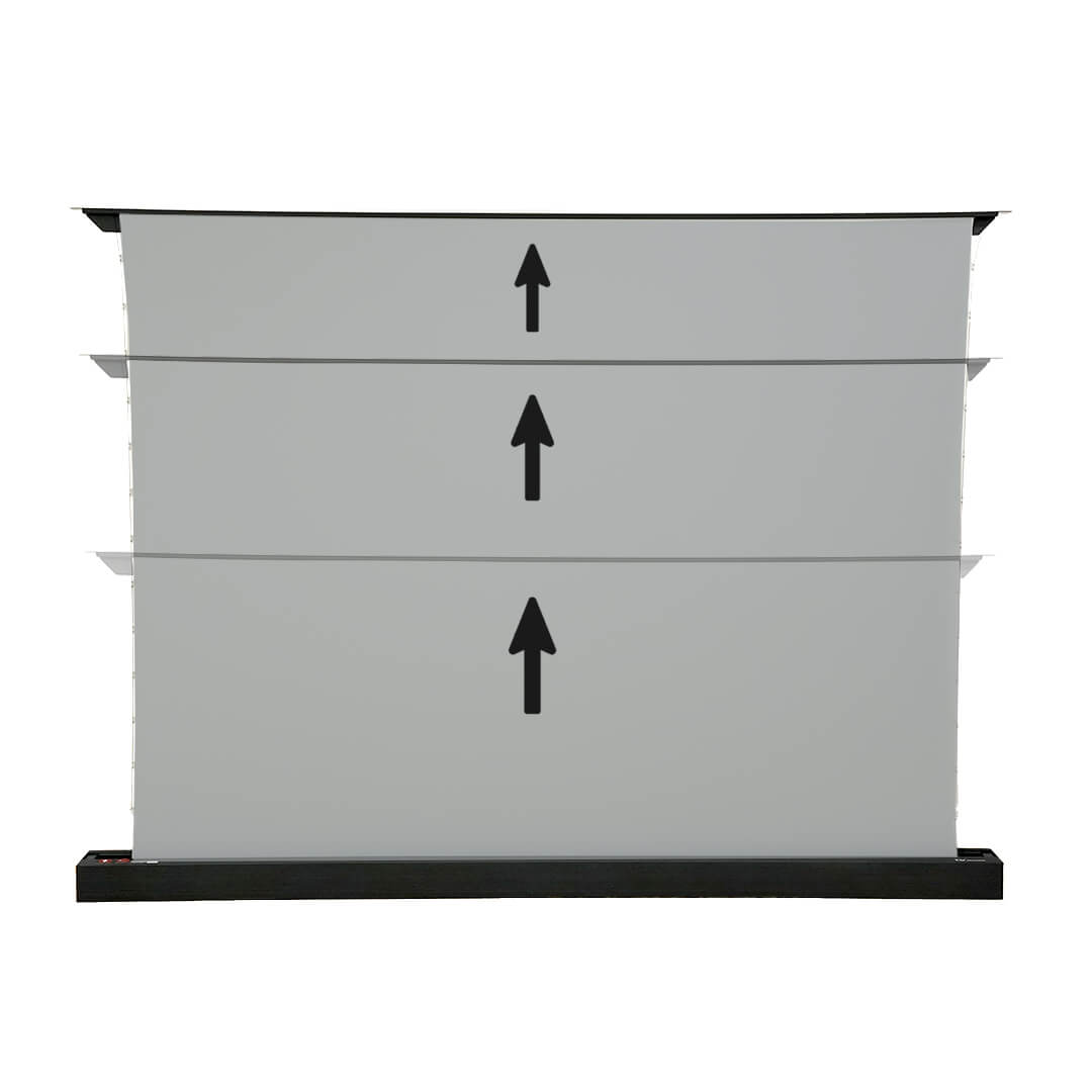 این پرده به دلیل نوع خاص عملکرد خود، درون یک پایه جمع میشود و بهصورت برقی از پایین به سمت بالا باز میشود.