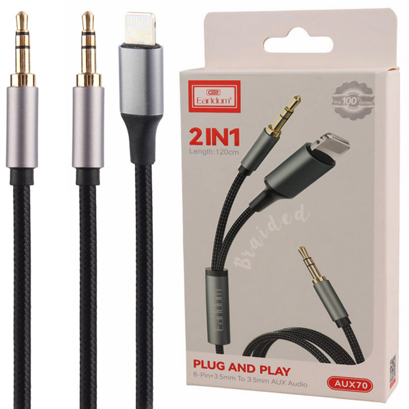 مبدل جک 3.5 میلی متری صدا به جک 3.5 متری و لایتنینگ Earldom مدل ET-AUX70 طول 120 سانتی متر