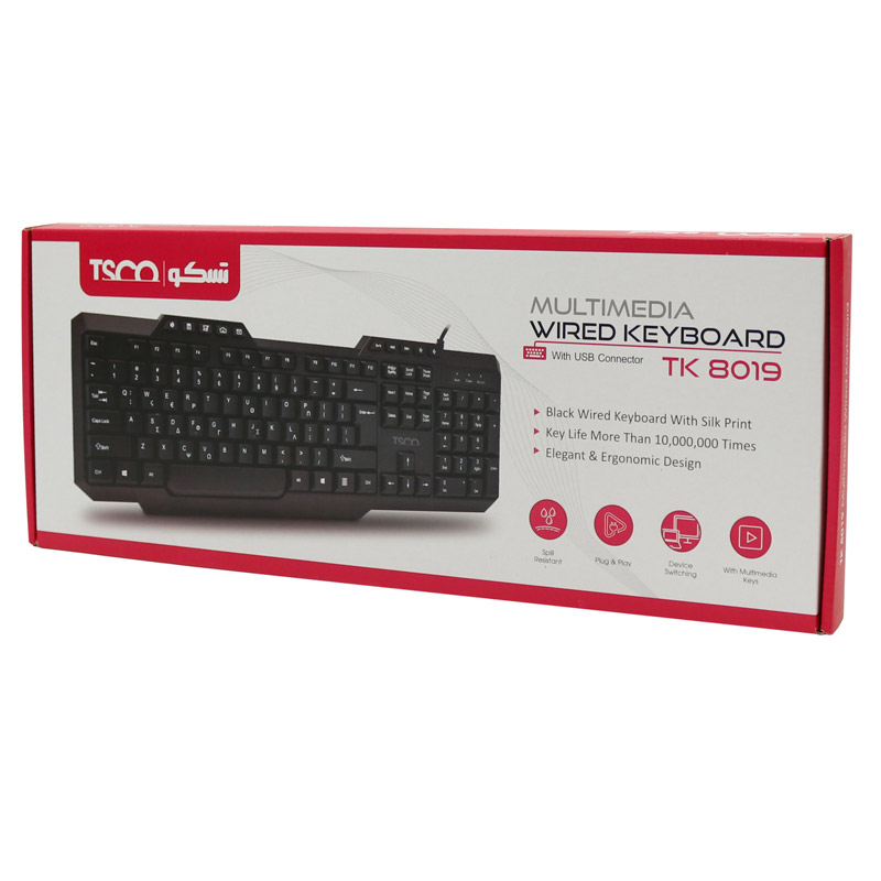 شرکت تسکو برای بالا رفتن سرعت کار و راحتی کاربر ۱۰ عدد کلید میانبر قرار داده که هر کدام فرمان خاصی را اجرا می کنند. TK8019 مجهز به ۲ پایه در پایین کیبورد می باشد که به کاربر امکان تنظیم زاویه کار با کیبورد را می دهد. این کیبورد توسط یک کابل ۱٫۸ متری با روکش پلاستیک و مقاوم در برابر پاره شدن، گره خوردن و کشیدگی از نوع USB به کامپیوتر یا لپ تاپ شما متصل می شود، TK-8019 سازگار با سیستم عامل های ویندوز، مک، لینوکس و اندروید می باشد و بدون نیاز به درایور شناخته می شود این مسئله باعث بالا رفتن سرعت کار با این کیبورد می شود. در کل این محصول یک کیبورد باکیفیت و اقتصادی است که مناسب برای اداره جات و مصارف خانگی می باشد.