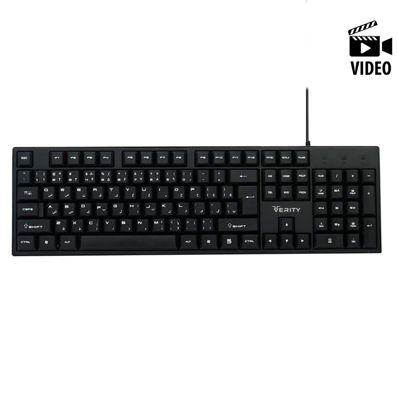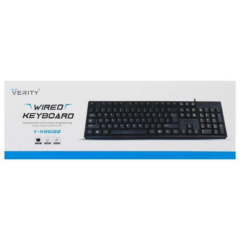 کیبورد وریتی مدل Verity V-KB6122 با بدنه خوش ساخت به جنس پلاستیک مقاوم در برابر ضربه و کلیدهای باکیفیت و نرم روانه ی بازار شده است. اتصال این محصول به انواع لپ تاپ و سیستم های کامپیوتری از طریق سیم انجام می گیرد که دارای روکش TPE برای محافظت در مقابل گره خوردگی و پارگی است. رابط اتصال در نظر گرفته شده برای این کابل با طول مناسب ۱۵۰ سانتی متر نیز، از نوع USB خواهد بود. وریتی برای صفحه کلید خود تعداد ۱۰۴ عدد کلید با حک فارسی و میزان ضربه پذیری در حدود ۸ میلیون بار کلیک تعبیه نموده تا VKB6122 مناسب استفاده های اداری و انجام تایپ در مراکز و سازمان های مختلف باشد. کیبورد باسیم Verity همچنین دارای سه نشانگر LED جهت اطلاع از وضعیت روشن بودن کلیدهای Caps Lock، اعداد و … بوده و موفق به کسب گواهی سلامت و ایمنی محصول CE شده است.