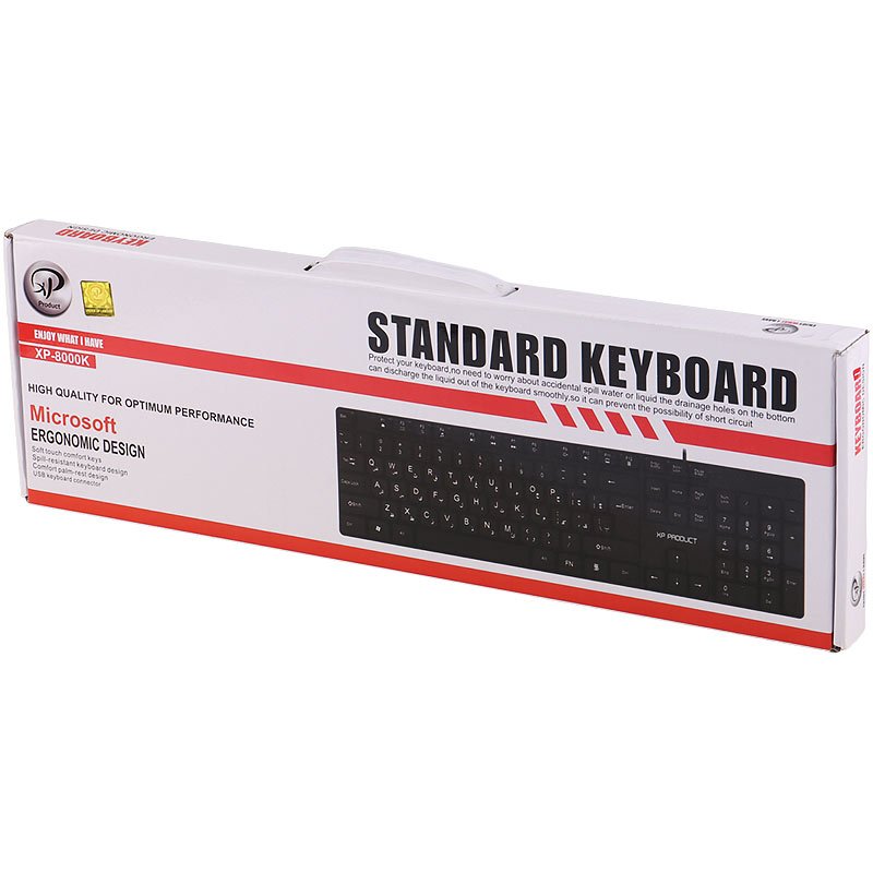 شرکت XP یکی از شرکت های فعال در عرصه تولید لوازم جانبی هوشمند به حساب می آید که تولیداتی مانند موس، کیبورد و… را به بازار عرضه می کند. این شرکت با معرفی محصولات متنوع با مشخصات و کیفیت مناسب توانسته نظر مخاطبان را به خود جلب کند. کیبورد مدل XP-8000K به صورت ارگونومیک توسط شرکت XP طراحی شده و در استفاده های طولانی مدت کاربر را دچار خستگی نمی کند. کیبورد XP به صورت پیش فرض دارای اعداد و حروف فارسی می باشد و نیازی به استفاده از برچسب برای این کیبورد نیست. کلید های کیبورد XP مدل XP-8000K با فاصله مناسب از یکدیگر چیده شده اند تا کاربران به راحتی هر چه بیشتر بتوانند با کیبورد به تایپ متون خود بپردازند. شرکت XP برای این کیبورد از قسمت جداگانه اعداد هم استفاده کرده تا تایپ اعداد با این کیبورد با سرعت بیشتری صورت بگیرد. ویژگی هایی مانند طراحی ارگونومیک، عمر مناسب و استفاده از پورت USB برای اتصال به رایانه یا دستگاه DVR، این کیبورد را به یک محصول مناسب جهت تایپ متون برای کاربران تبدیل می کنند.